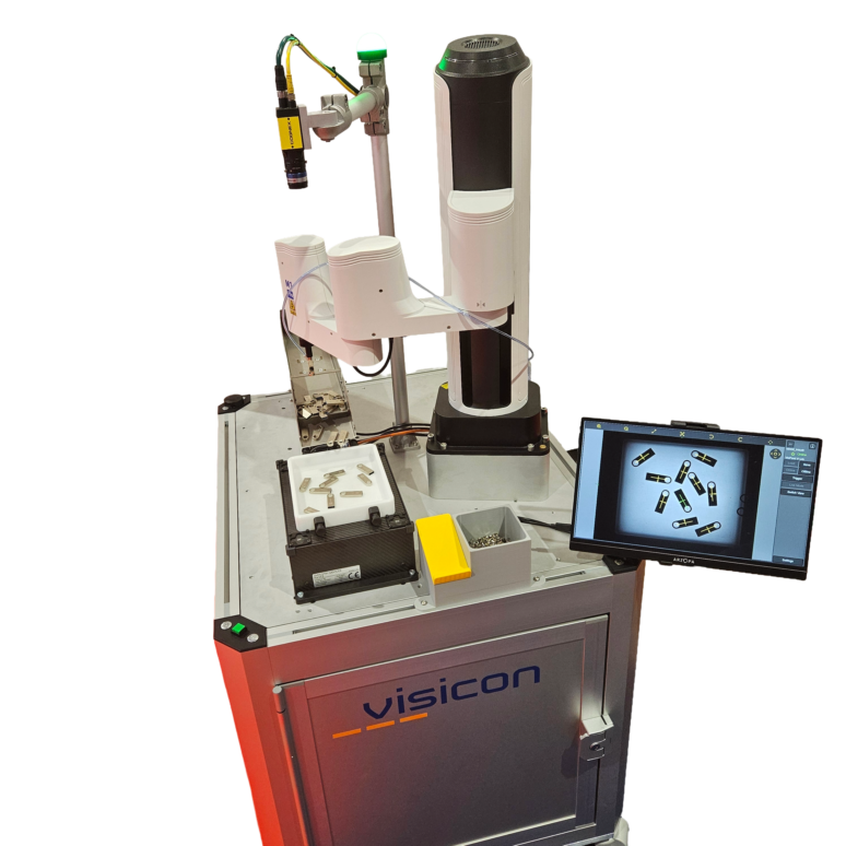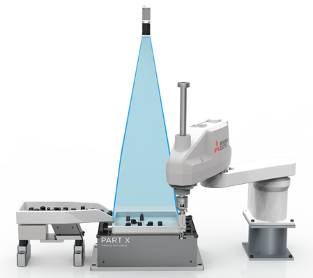 PartX Vibration technology separates and orientates parts for robot picking. A camera locates the correctly orientated parts and sends coordinates to the robot. Additionally, the integrated Vision system detects and adjusts the number of parts inside the flexible feeder.